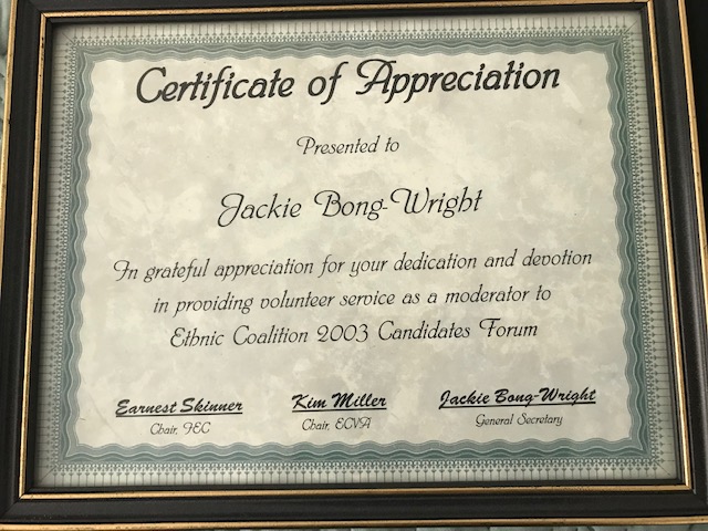 2003 - Providing volunteer service as a moderator to Ethnic Coalition 2003 Candidates Forum