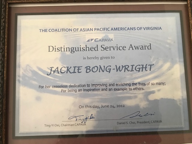 2012 – Civic Engagement Recognition by Coalition of Asian American & Pacific Association of Virginia (CAPAVA) for 10 years of service