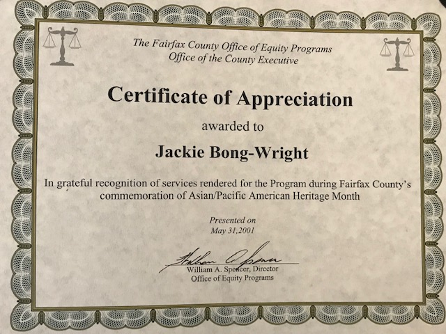 In grateful recognition of services rendered for the Program during Fairfax County’s commemoration of Asian/Pacific American Heritage Month 2001